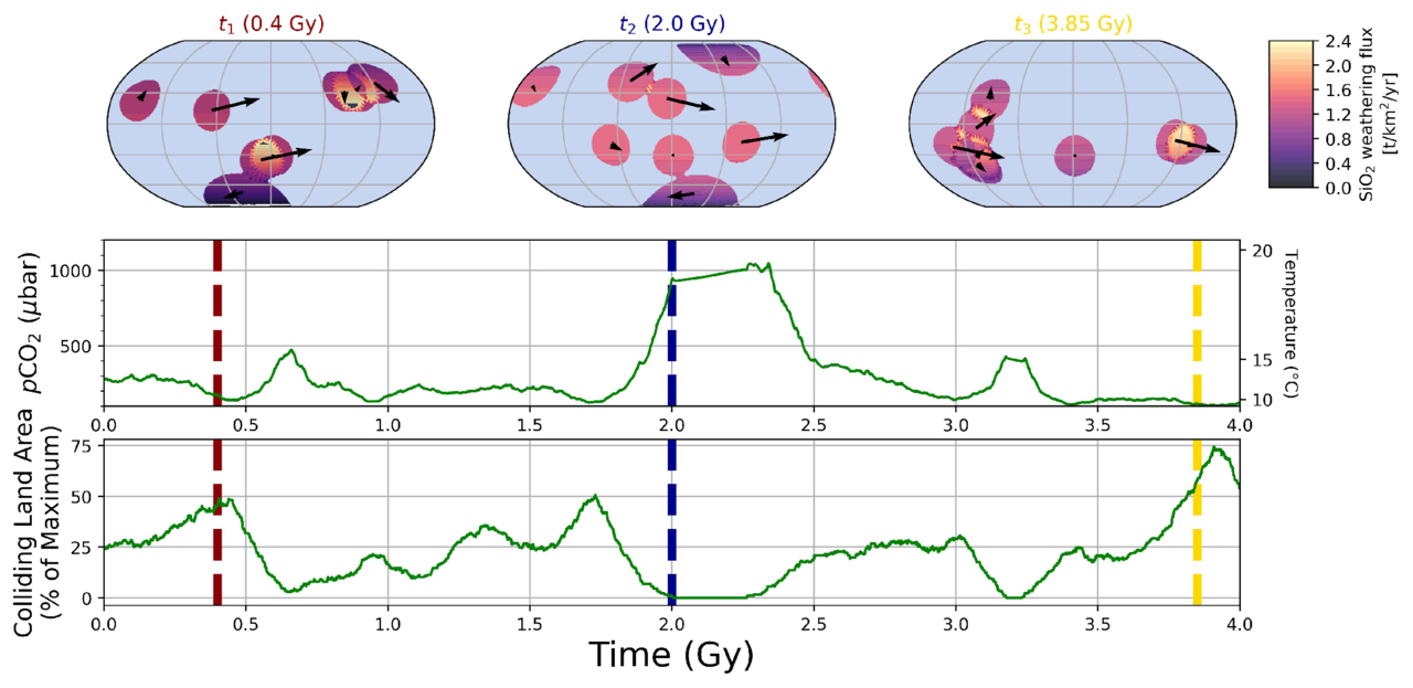 In 2025, I published a study modeling the senstivity of this process to the randomness of plate tectonic collisions, using a model developed by me title DISKWORLD. We found that additional processes resupplying surface rock, such as wind-driven dust transpot, glacial erosion, and seafloor weathering, are likely required in addition to tectonic collisions to keep Earth-like planets habitable over geologic timescales.